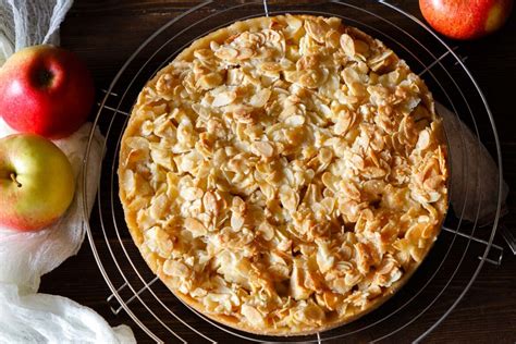 Den Ofen auf 160 Grad Umluft (oder 180 Grad Ober-/Unterhitze) vorheizen. Die Springform aus dem Kühlschrank holen. Die Apfelstücke gleichmäßig auf dem Teigboden verteilen. Den Mandelguss darüber gießen und gleichmäßig verstreichen. Den Kuchen für ca. 60 Minuten im vorgeheizten Ofen backen, bis er goldbraun ist. Den Rand vorsichtig mit einem kleinen Messer lösen. Den Kuchen ganz auskühlen lassen, bevor er angeschnitten wird.