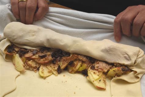 Das Einrollen des Strudels erfordert etwas Geschick, damit die Füllung nicht herausquillt. Hier eine detaillierte Anleitung: