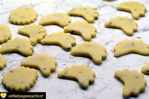 Die Zutaten verkneten und den Teig für eine Stunde kalt stellen. Danach ausrollen, stempeln und bei 180°C ca. 10-12 Minuten backen.