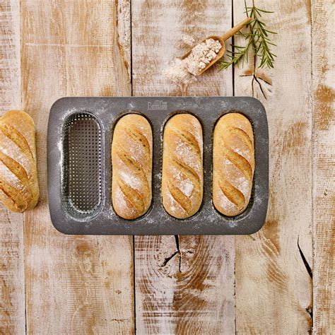 In diesem Master Class Bagette Blech mit Wölbung und spezieller Perforierung werden Ihre selbstgebackenen Baguettes besonders knusprig. Das Baguetteblech ist gelocht, so dass die Warmluft optimal zikulieren kann und ein knuspriges Backergebnis gewährleistet ist. Die doppelte Antihaftbeschichtung des Baguette-Blech ist ideal von Baguetttes aus frischem Teig eignet sich aber auch zum Aufbacken von vorgebackenen französischen Baguettes.