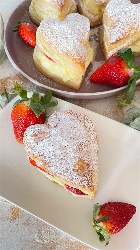 Blätterteig flach auslegen, mit etwas Zucker bestreuen und in der Hälfte überschlagen, sodass ein Rechteck von ca. 12,5 x 24 cm entsteht. Mit dem restlichen Zucker zu einem Rechteck von ca. 20 x 30 cm auswallen. Beide Enden der Schmalseite je zweimal nach innen legen, sodass eine Herzform entsteht. 30-60 Minuten kühl stellen.