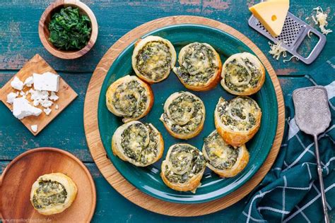 Eine weitere leckere Variante sind Blätterteigschnecken mit Spinat und Quark. Hierfür wird der Blätterteig mit Quark bestrichen und mit Spinat belegt. Anschließend wird der Teig aufgerollt und in Scheiben geschnitten.