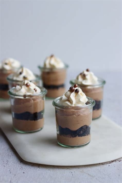- Für den Boden: Petits Beurre® in der Küchenmaschine oder in einem Plastikbeutel zerkleinern, sodass eine feinsandige Masse entsteht. Mit der geschmolzenen Butter vermengen. Mithilfe eines Löffels in 10 Gläschen à je 1dl verteilen und leicht andrücken.