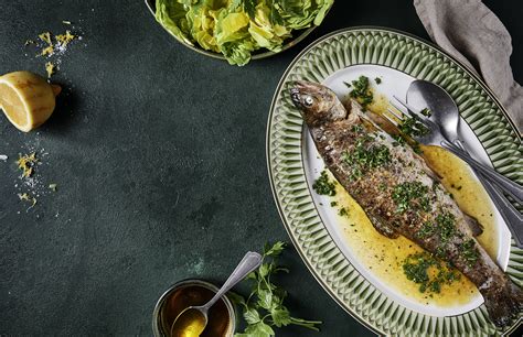 - Etwas Olivenöl in einer Pfanne erhitzen und die Forellen auf jeder Seite etwa für 5 Minuten braun braten. Mit je einem Zitronenschnitz garnieren.