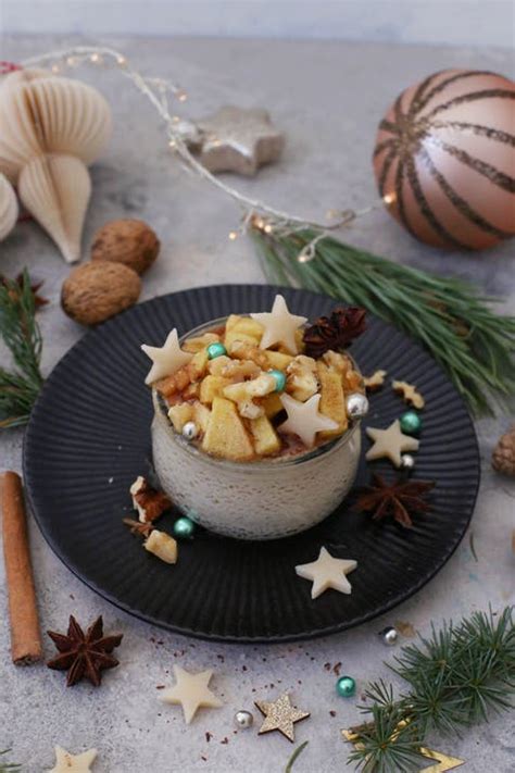 - Das Marzipan 3 bis 4 mm dünn ausrollen und kleine Sterne daraus ausstechen. Walnüsse klein hacken. Das Dessert damit und mit Zuckerperlen garnieren.