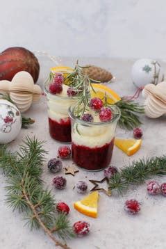 - In Gläser die Beeren füllen und die Creme darauf verteilen. Mit Rosmarin, Cranberrys, Orangen dekorieren.