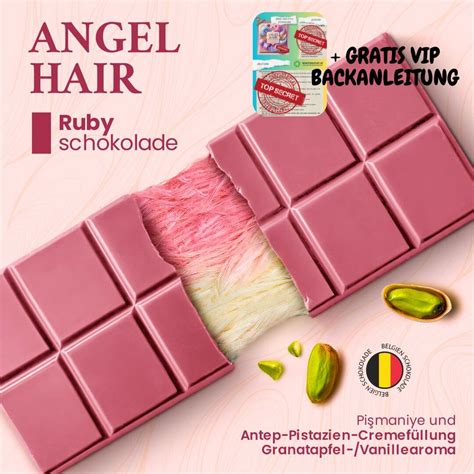Die Angel Hair Schokolade ist eine Kreation des belgischen Herstellers Tucho. Was diese Schokolade so besonders macht, ist ihre außergewöhnliche Füllung: Pişmaniye, eine traditionelle türkische Zuckerwatte, kombiniert mit Pistaziencreme und einem Hauch von Vanille, Granatapfel und Himbeere. Beim Aufbrechen der Tafel kommen feine, haarähnliche Fäden zum Vorschein, die der Schokolade ihren Namen geben.