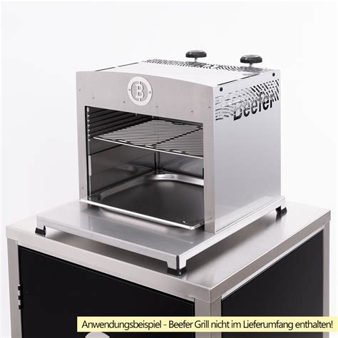 Der Beefer ist ein Grill der neuen Generation und ein Gerät der Extraklasse. Er ist zugeschnitten auf die veränderten Ansprüche von Geniessern, für die bewusster Genuss und ausgezeichnete Qualität von hoher Relevanz sind. Ausschließlich mit Oberhitze arbeitend, erreicht er ungewöhnlich hohe Temperaturen von ca. 800 Grad. Somit war Grillieren nie schneller und geschmackvoller. In Sekunden genießen Sie ein perfektes Steak - aber auch Fisch und Süßes kann im Beefer zubereitet werden.