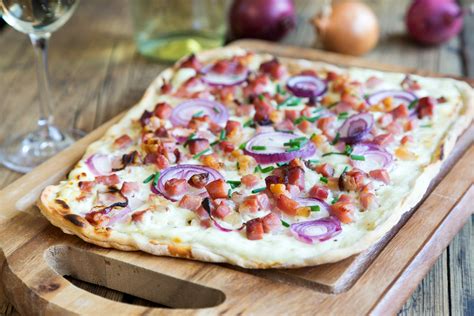 - Elsässer Flammkuchen: Speck, Zwiebeln und Schmand auf einem hauchdünn ausgerollten Teig - so kennen und lieben wir ihn.