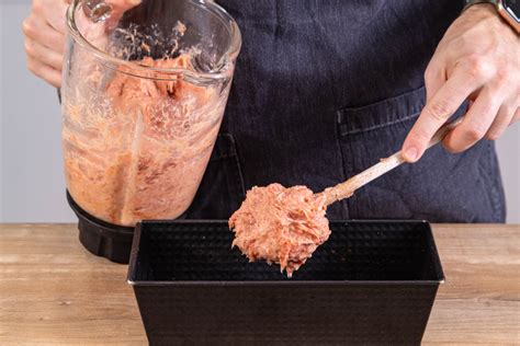 Um Fleischkäse selber zu machen, musst du zunächst die Wurstmasse mischen. Gebe dafür alle Zutaten in eine Schüssel und mixe sie mit einer Küchenmaschine oder einem Handrührgerät gut durch. Öle zunächst die Form (Kastenform, Pastetenform) ein, damit der Fleischkäse nachher nicht an ihr festklebt. Danach füllst du die Masse mit nassen Händen in die Form und streichst sie glatt. Das geht ebenfalls mit der Hand oder noch besser mit einem Teigschaber.