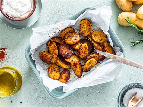 - Heize den Backofen auf 220 °C Ober-/Unterhitze (200 °C Umluft) vor. Ungeschälte Kartoffeln längs halbieren, vorsichtig mehrmals mit einer Gabel einstechen, mit Öl, Salz und Pfeffer würzen und mit der Schnittseite nach unten auf ein mit Backpapier belegtes Backblech legen. Auf der mittleren Schiene im Backofen ca. 30 Min. backen, bis die Kartoffeln weich sind.