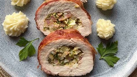 Dieses Rezept verwendet Truthahnbrust, gefüllt mit einer Mischung aus Dörrtomaten, Frühlingszwiebeln und Basilikum. Der Rohschinken umhüllt die Brust und sorgt für zusätzliche Würze.