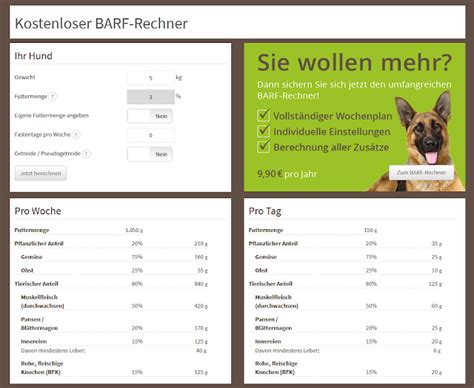 BARF-Rechner für Hunde zur Erstellung eines individuellen Futterplans.