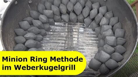 Für ein möglichst langes Grillerlebnis bei niedrigen Temperaturen stellt man die Briketts aus Holzkohle in zwei Reihen nebeneinander in einem Kreis auf den Kohlerost. Auf den beiden Reihen wird eine dritte platziert. Wichtig: Die Briketts müssen hochkant und eng aneinander stehen und sich untereinander berühren, damit die Glut sich Stück für Stück durch den Minion Ring fortbewegen kann.