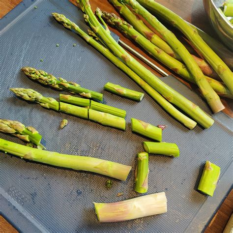 - Grüne Spargeln in der unteren Hälfte schälen und die Enden frisch anschneiden.