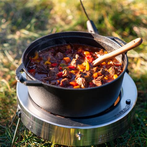 Im Dutch Oven hat es ideale Bedingungen, um butterweich zu werden und gleichzeitig eine tolle Würze anzunehmen. Das Schöne ist, dass du nur kurz die Zutaten vorbereiten musst und später alles andere der Dopf übernimmt. Würfle ganz grob Zwiebel, Sellerie und Möhre. Füge das Tomatenmark hinzu und brate es für extra Aromen mit an. Füge Zwiebel, Sellerie und Möhre hinzu und brate es ebenfalls mit an. Lösche mit Rotwein ab und fülle mit Rinderbrühe so auf, dass das Fleisch leicht bedeckt ist. Nach 90-120 Minuten fügst du die Paprikastücke hinzu und schmeckst das Gulasch mit den Gewürzen ab. Damit das Fleisch nicht zäh wird, gibt das Gulasch Rezept eine Schmorzeit vor. Je nach Teilstück sollte der Eintopf mindestens zwei Sunden köcheln. Je mehr Bindegewebe das Fleisch hat, desto länger. Am besten machst du eine Geschmacksprobe.