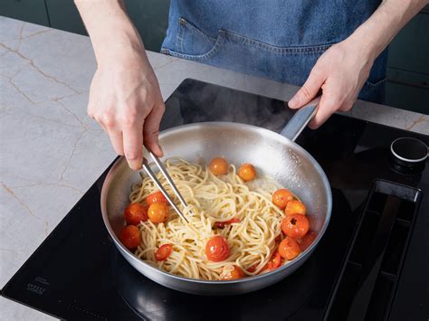 Pasta kochen: In einem großen Topf Salzwasser zum Kochen bringen und die Spaghetti darin al dente kochen. Etwas Kochwasser beiseite stellen.