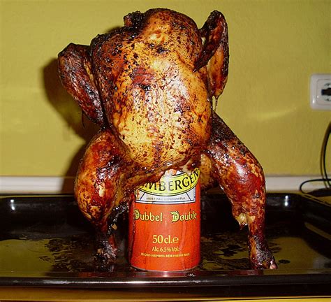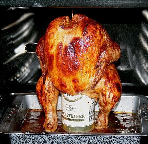 Das Prinzip ist einfach: Das Hähnchen wird auf eine geöffnete Bierdose gesetzt, deren Inhalt verdampft und das Fleisch von innen saftig und zart macht. Gleichzeitig wird die Haut aussen schön knusprig.