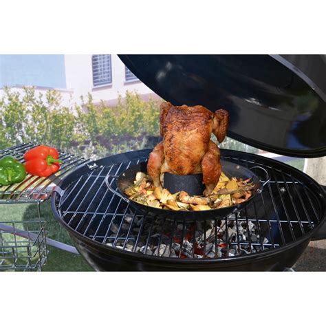 Die antihaftbeschichtete Oberfläche garantiert, dass kein Fleisch am Geflügelhalter haften bleibt. Ein integrierter Behälter dient dem Aromatisieren des Geflügels, indem Sie ihn einfach mit Marinade, Bier oder anderen schmackhaften Flüssigkeiten füllen. Um das mittig positionierte Geflügel kann in der Schale noch Gemüse oder anderes Grillgut garen.