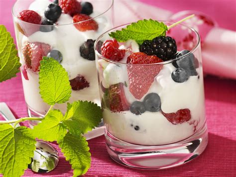 - Joghurtcrème mit Früchten: Einfach Joghurt mit Früchten der Saison kombinieren.