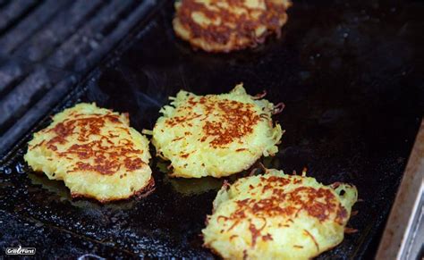Kartoffelpuffer kannst du auf unterschiedliche Weise und mit verschiedenen Hilfsmitteln zubereiten. Möglich ist es beispielsweise in einer Gusseisenpfanne mit reichlich Öl oder Butterschmalz. Du kannst als Pfannenalternative auch den Deckel eines Dutch Ovens verwenden oder den Topf selbst und die Reibekuchen frittieren. Wunderbar funktioniert das Ausbacken auch auf einer Grillplatte oder einer Edelstahlplancha. Auch hierbei solltest du darauf achten, dass du Öl bzw. Fett verwendest, damit deine Puffer nicht anbrennen und gleichzeitig schön braun werden.