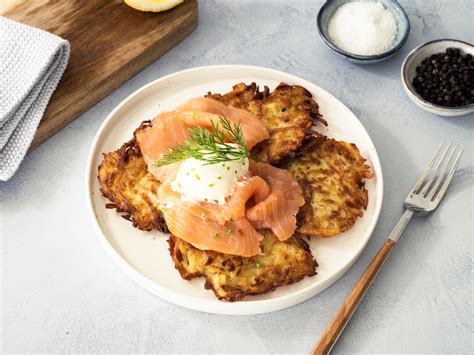 Dieses Gericht macht Deinen Brunch zu einem echten Highlight für Gaumen & Augen: in Türmchen mit knusprigen Kartoffelpuffern, feinem Räucherlachs, Avocado und frischem Schnittlauch, verfeinert mit einer würzigen Kräutercreme.