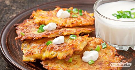 Es wird zudem auf vegane und herzhafte Kombinationen hingewiesen. So wird empfohlen, Kartoffelpuffer mit Lachs zu kombinieren, wobei ein selbstgemachter Frischkäsedip dazugegeben werden kann. Dieses Rezept wird als Möglichkeit vorgestellt, aus dem süßen Puffer eine vollwertige Mahlzeit zu machen.