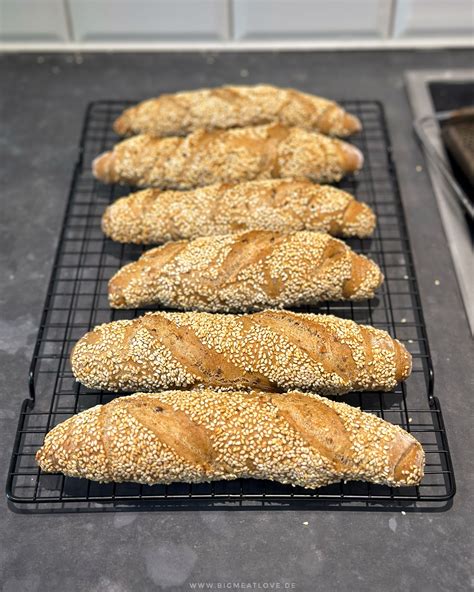 Vom Teig 10 Portionen abstechen und rundschleifen. Die Teiglinge 10 Minuten entspannen lassen und mit der Hand zu ovalen Fladen drücken. Auf ein vorbereitetes Backblech setzen. Solange der Backofen aufheizt, 20-30 Minuten, abgedeckt gehen lassen. Stangen unter Schwaden in den Backofen schieben und 10 Minuten anbacken. Schwaden ablassen, Temperatur auf 190°C drosseln und ca.