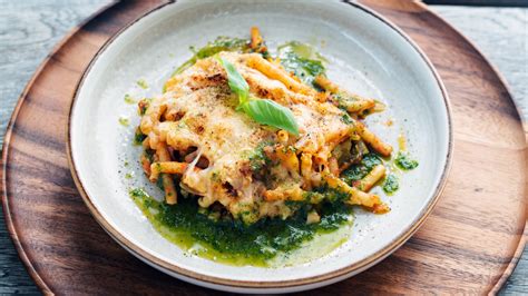 - Makkaroni-Käse-Gratin auf Teller verteilen, mit zerkleinertem Basilikum und Pinienkernen bestreuen und genießen.