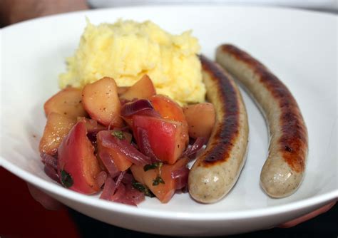 - Kräuter-Kartoffelpüree, Apfel-Zwiebel-Gemüse und Bratwürste auf Tellern verteilen und mit Senf servieren.