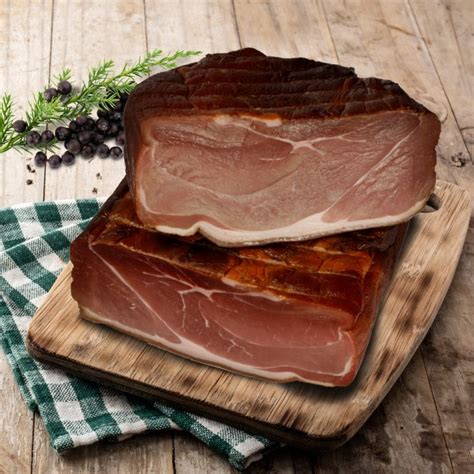 - Südtiroler Speck: Herkunft Italien, Südtirol. Nach dem Pökeln wird er über Nadelholz kalt geräuchert und reift dann noch gut 5 Monate an der Luft. Er ist nussig, würzig, kernig und hat einen gewissen Biss.