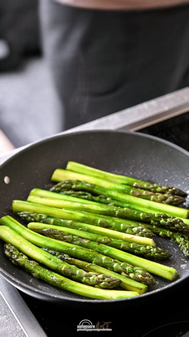 - In einer beschichteten Bratpfanne etwa 1 cm hoch Bratbutter erhitzen. Sobald kleine Bläschen an einem Holzstäbchen hochsteigen, dass man ins Fett taucht, die Spargeln portionenweise in der Bratbutter langsam goldbraun backen. Den Knoblauch leicht angequetscht dazugeben, damit er sein Aroma abgeben kann.