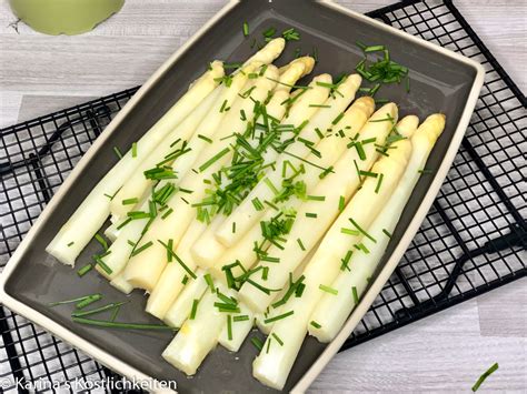 - In einem Topf reichlich Wasser erhitzen, 1 TL Zucker, Salz und Butter dazugeben. Den Spargel darin etwa 15 Minuten bissfest kochen. Mit der Schöpfkelle herausnehmen, in ein Sieb geben, mit kaltem Wasser abschrecken, gut abtrocknen und mit Salz und Pfeffer würzen.