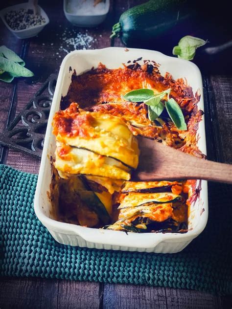 Eine Gratinform mit Olivenöl einpinseln. Boden mit Aubergine belegen und etwas geröstete Zwiebel darüberstreuen. Mit etwa einem Drittel der Tomatensauce übergiessen, mit etwas Käse bestreuen. Zucchinischeiben darauflegen, Rest der Zwiebel darüberstreuen und mit Käse bestreuen. Ein weiterer Drittel der Tomatensauce darübergiessen. In die Mitte des Ofens einschieben und ca. 25 Minuten gratinieren.