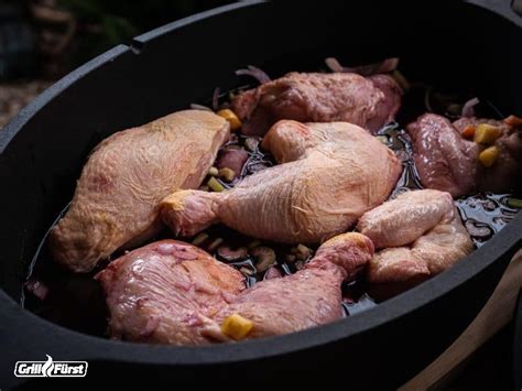 Für noch mehr Geschmack kannst du einige der Zutaten für diesen französischen Klassiker auf dem Gusseisenrost grillieren, bevor du sie in den Dutch Oven gibst.