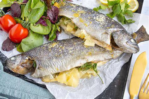 - Gemüse: Eine ganze Forelle im Ofen gegart, kombiniert mit einer Auswahl saisonaler Gemüse, zaubert euch in Nullkommanix ein gesundes und v.a. leckeres Dinner.