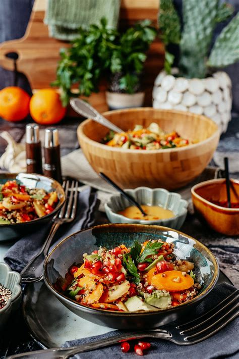 Gemüse und Apfel mit dem Dressing und Koriander mischen, Feta, Trauben und Kürbiskerne darüberstreuen.