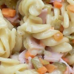 Ein Klassiker. Salatcreme oder Mayonnaise mit kleingeschnittenen Gewürzgurken, Erbsen und Schinkenwurst vermengen, dann die kalten Nudeln unterheben.
