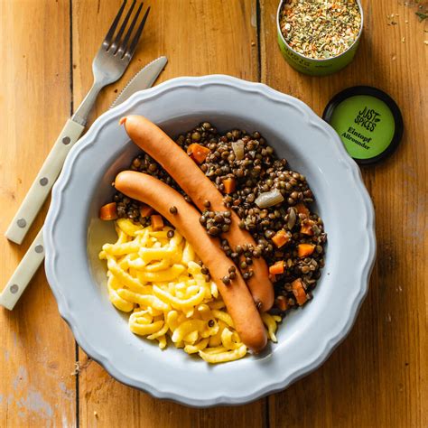 Linsen mit Spätzle sind ein deftiges Gericht, das in vielen Haushalten in Schwaben traditionell serviert wird. Der Geschmack wird durch die Kombination aus saurer Note der Linsen und der buttrigen Konsistenz der Spätzle geprägt. Je nach Vorliebe können Spätzle frisch oder aus dem Kühlregal verwendet werden.