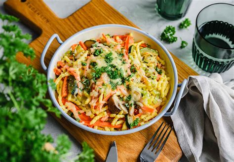 Für alle, die es etwas deftiger mögen, ist der Spätzli-Gemüse-Gratin eine hervorragende Wahl. Hierbei werden Spätzle mit saisonalem Gemüse und Käse überbacken.