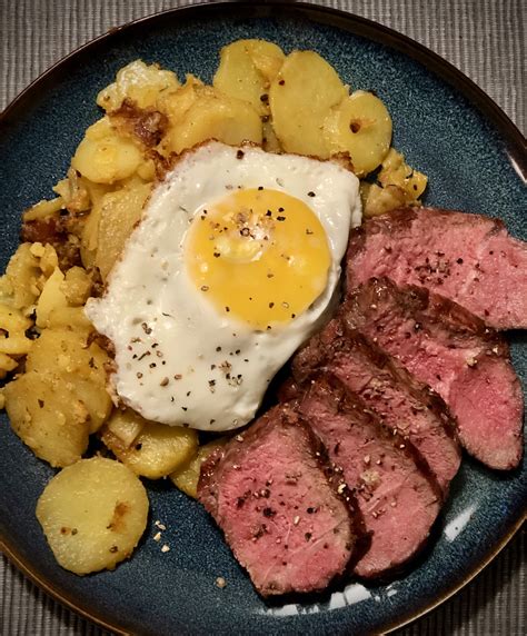- In einer großen Pfanne Öl erhitzen und Steaks je Seite 1 - 2 Min. (für rare), 2 - 3 Min. (für medium), 3 - 4 Min. (für well done) braten.
