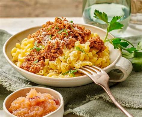 - Vegane Spaghetti Bolognese: Soja-Granulat in heisser Brühe einweichen, mit Zwiebeln, Knoblauch und passierten Tomaten köcheln lassen und mit frischen Kräutern und Soja-Sauce abschmecken.