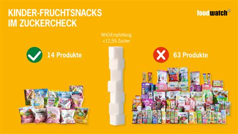 Ein Test der deutschen Organisation Foodwatch hat ergeben, dass viele Fruchtsnacks für Kinder, die mit «ohne Zuckerzusatz» werben, dennoch einen hohen Zuckergehalt aufweisen. Im Schnitt bestehen die Fruchtsnacks zu rund einem Drittel aus Zucker. Zwei Snacks kamen gar auf einen Zuckergehalt von fast drei Vierteln, die Obsties Erdbeere Banane mit Joghurt von Alete und die Rosinchen von Freche Freunde.
