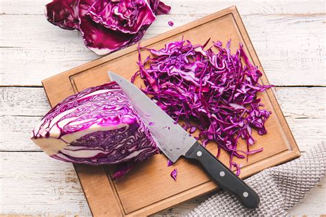 - Befreie den Kohlkopf von seinem Strunk und schneide oder hoble den Kohl zu feinen Streifen.